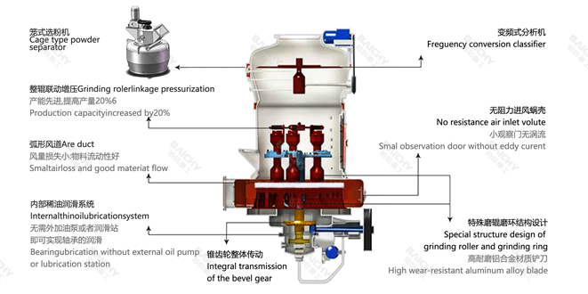 2.研磨粉碎??:磨腔內(nèi),磨輥在離心力作用下緊壓磨環(huán),物料在磨輥與磨環(huán)之間受到碾壓、沖擊、剪切作用被粉碎。