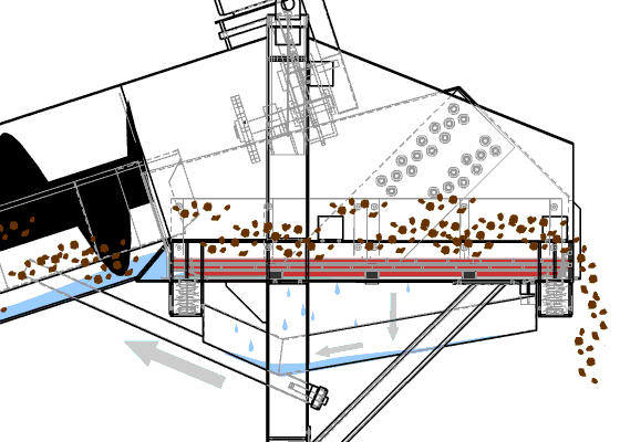 螺旋分級(jí)機(jī)是借助于固體粒大小不同,比重不同,因而在液體中的沉降速度不同的原理,細(xì)礦粒浮游在水中成溢流出,粗礦粒沉于槽底。